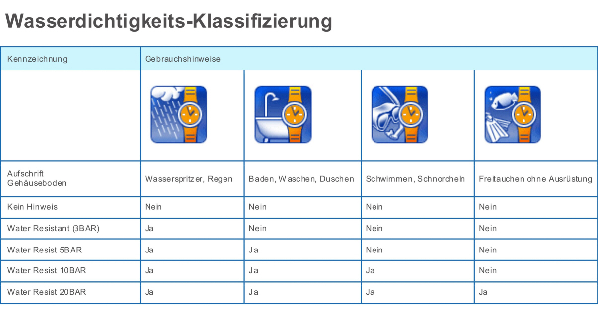 Diese Uhr eignet sich für Autowaschen, Regen, Wasserspritzer, Schweiß. Natürlich keinesfalls um damit 30 Meter tief zu tauchen. Bitte beachten Sie dabei, Reinigungsmittel, wie sie beim Autowaschen verwendet werden können die Oberflächenspannung zwischen Glas und Uhrengehäuse verringern und so das Eindringen von Wasser ermöglichen.